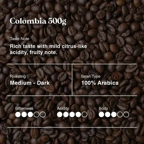 Colombian coffee with fruity notes and a mild citrus acidity, ideal for a refreshing cup.